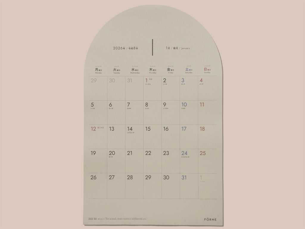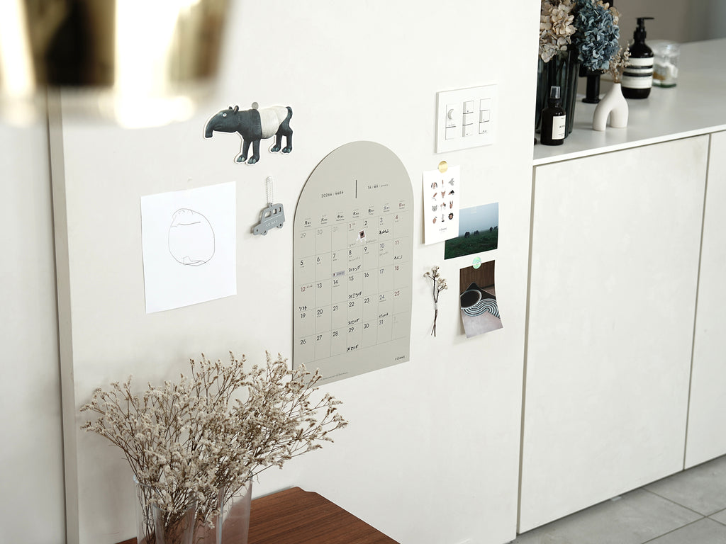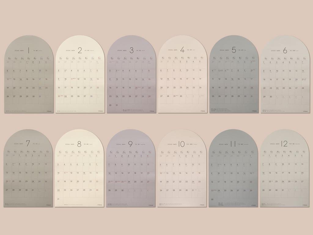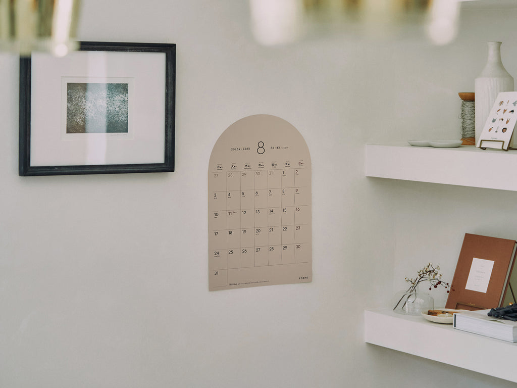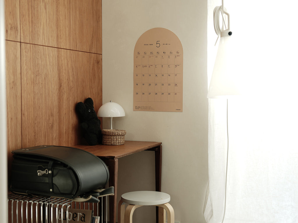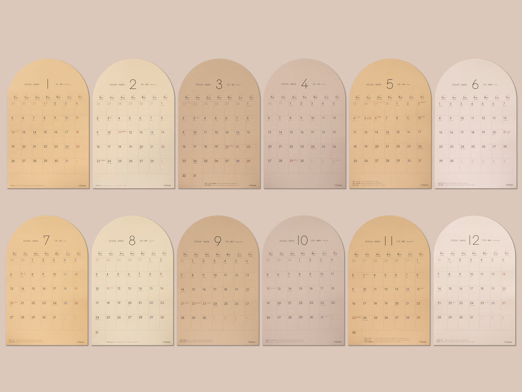 フォルネらしいアーチ型デザインと絶妙なトーンのニュアンスカラーが、インテリアにすっと溶け込みます。月部分はさりげなく可愛いドット文字、日付部分には見やすいゴシック系の字体を採用。離れた位置からでも見やすく、家族みんなが使いやすいカレンダーに仕上げました。