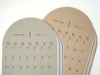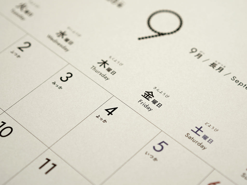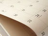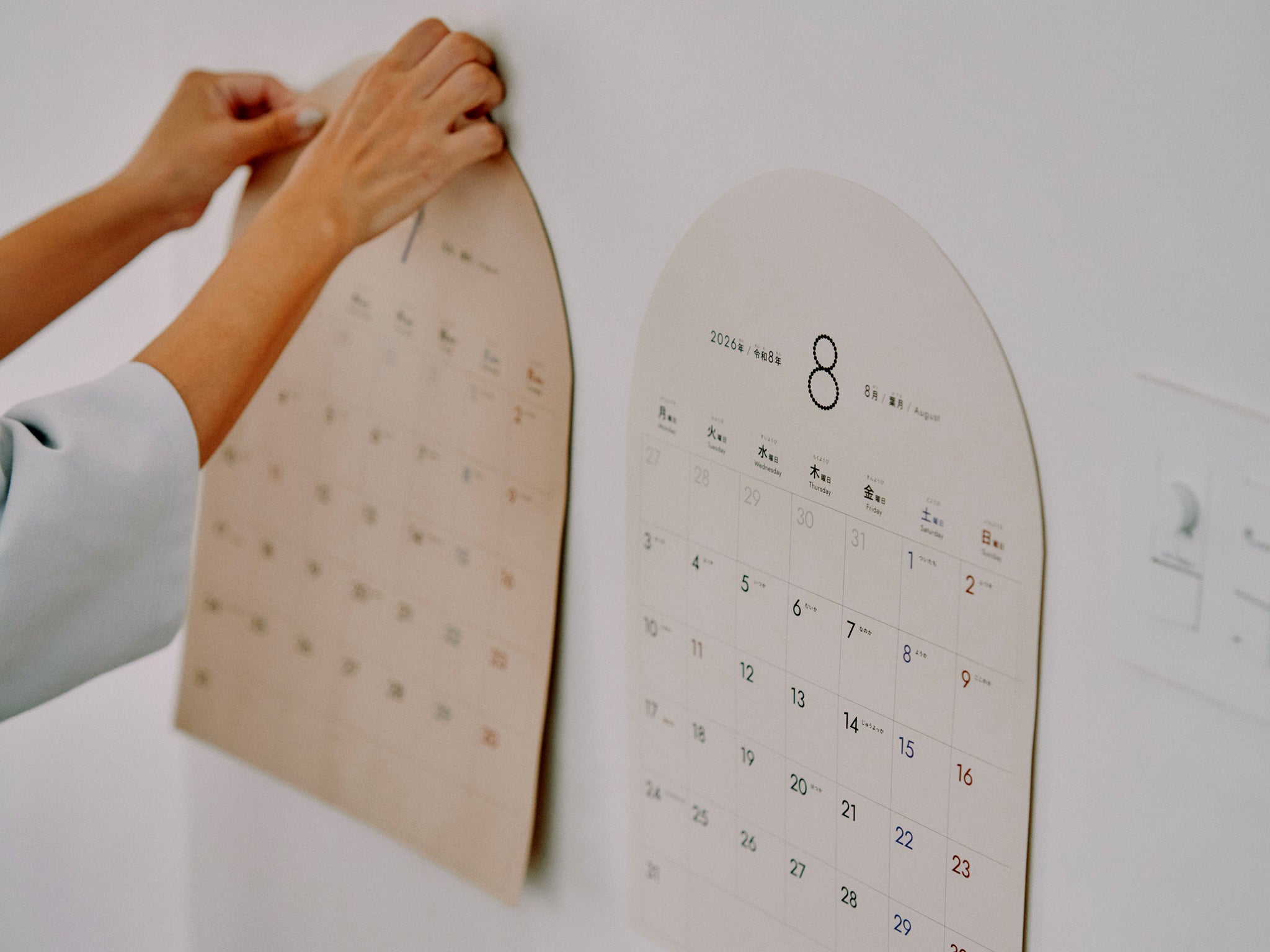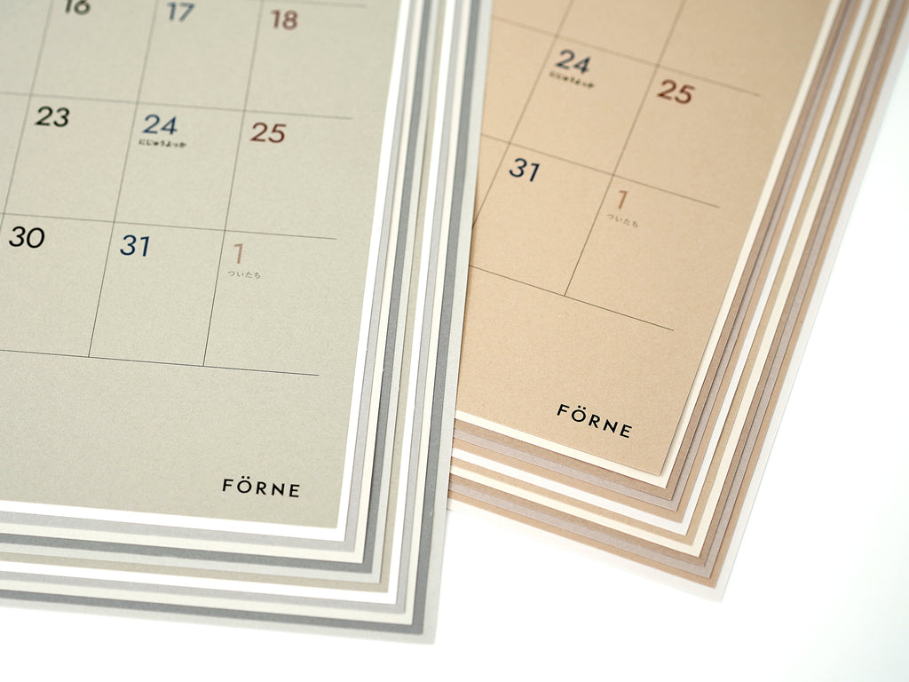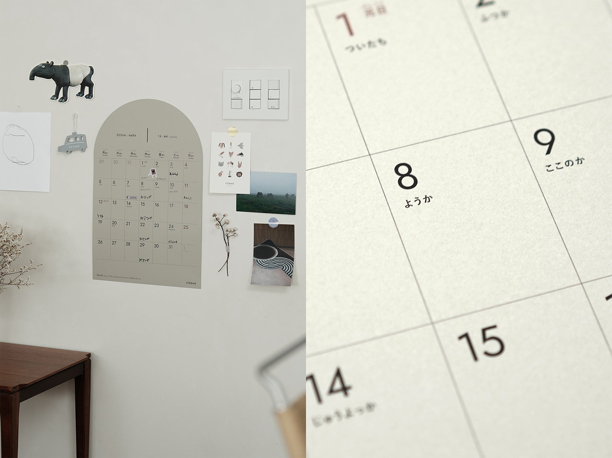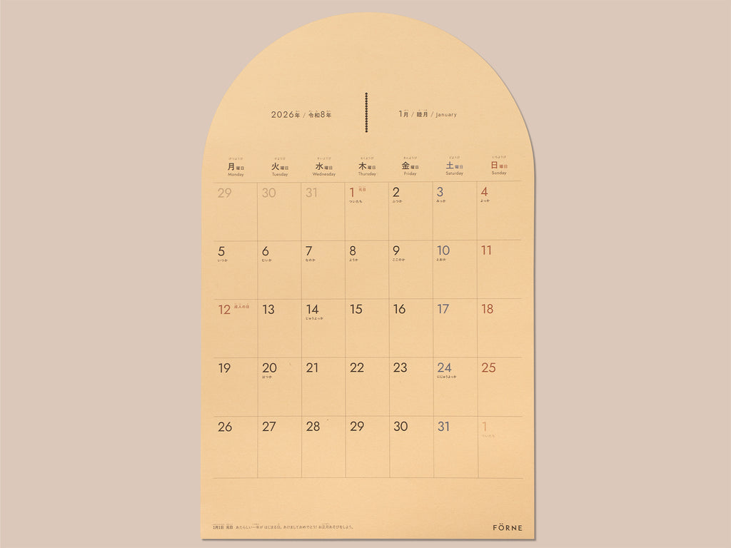 フォルネらしいアーチ型デザインと絶妙なトーンのニュアンスカラーが、インテリアにすっと溶け込みます。月部分はさりげなく可愛いドット文字、日付部分には見やすいゴシック系の字体を採用。離れた位置からでも見やすく、家族みんなが使いやすいカレンダーに仕上げました。