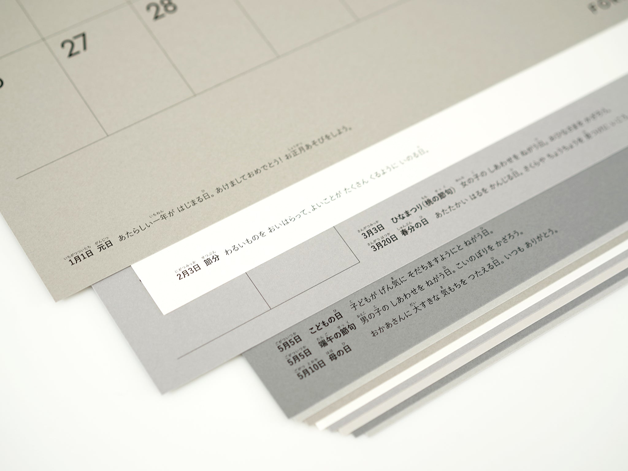 節分やひなまつり、こどもの日、ハロウィン、七五三……カレンダーの下部には、子どもに関連するイベントや祝日をわかりやすい言葉で解説。行事の意味や楽しみ方を親子で話すことで、季節のうつり変わりを感じられ、日本の文化への学びも自然と深まります。