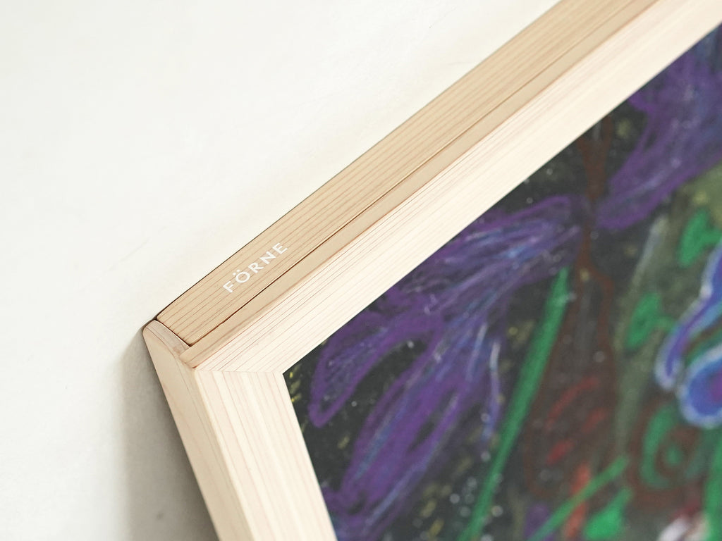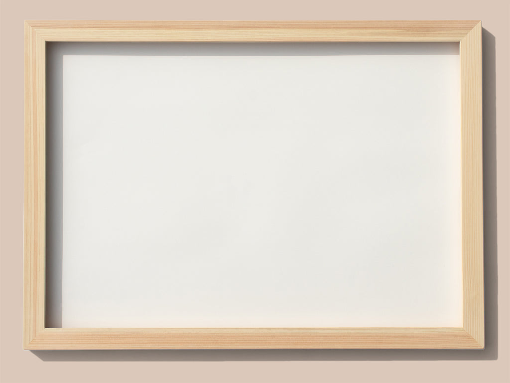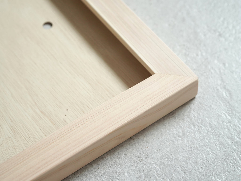 どんなスタイルのインテリアにもなじみやすく、主役である作品が引き立つ、シンプルな佇まい。国産ヒノキの無垢材を使用し、木のやさしい質感をそのまま生かしました。愛媛の職人が一つひとつ丁寧に製作しています。無塗装仕上げなので、使っていくうちにだんだんと色が濃くなり、味わい深く育っていくのも魅力です。