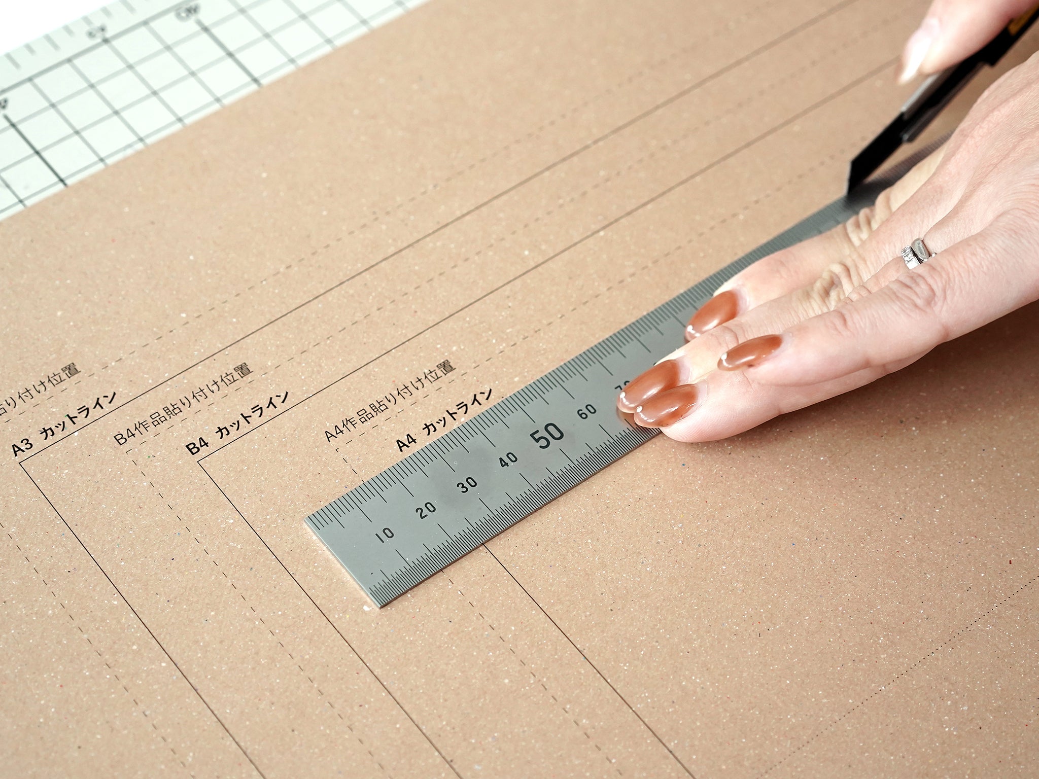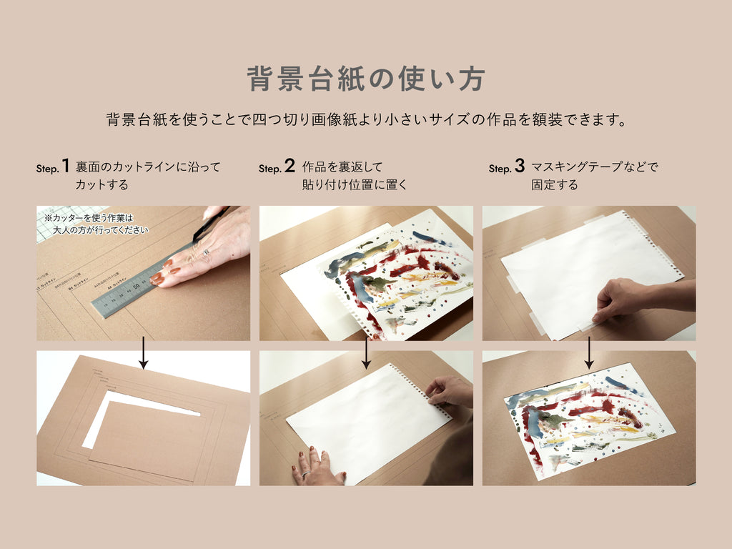 背景台紙は3サイズのガイド線入り。ガイド線に沿ってカットし、四つ切り画像紙より小さいサイズの作品を裏面から貼り付けることが可能です。