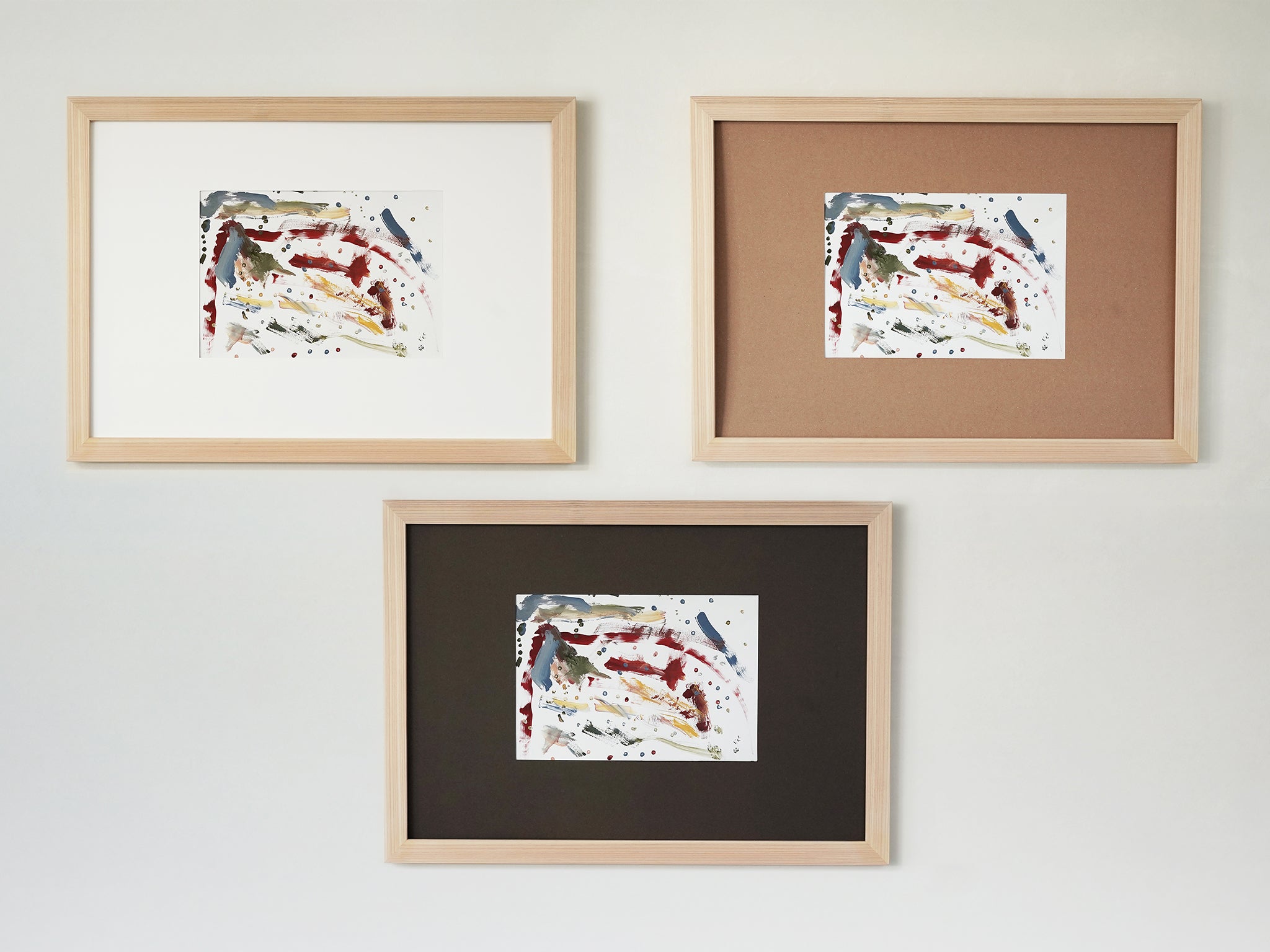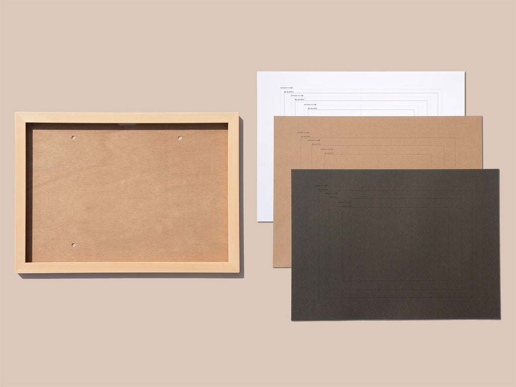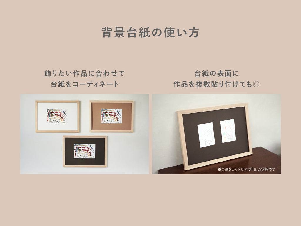 四つ切り画用紙より小さいサイズの作品は、背景台紙に貼り付けて飾れます。背景台紙はホワイト、チャコールグレー、クラフトの3色入り。作品に合わせて台紙の色を選ぶことで、飾ったときの印象がぐっと変わります。そのとき飾りたい作品に合わせて、気軽にコーディネートを楽しめます。