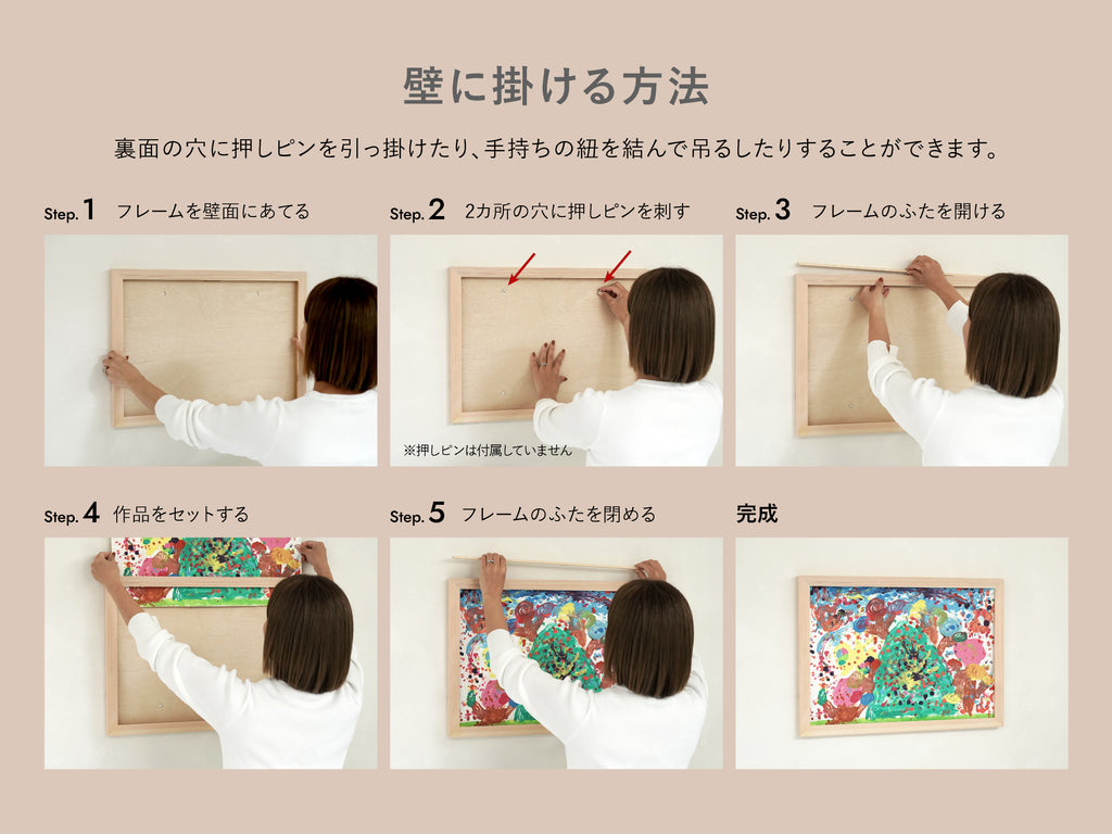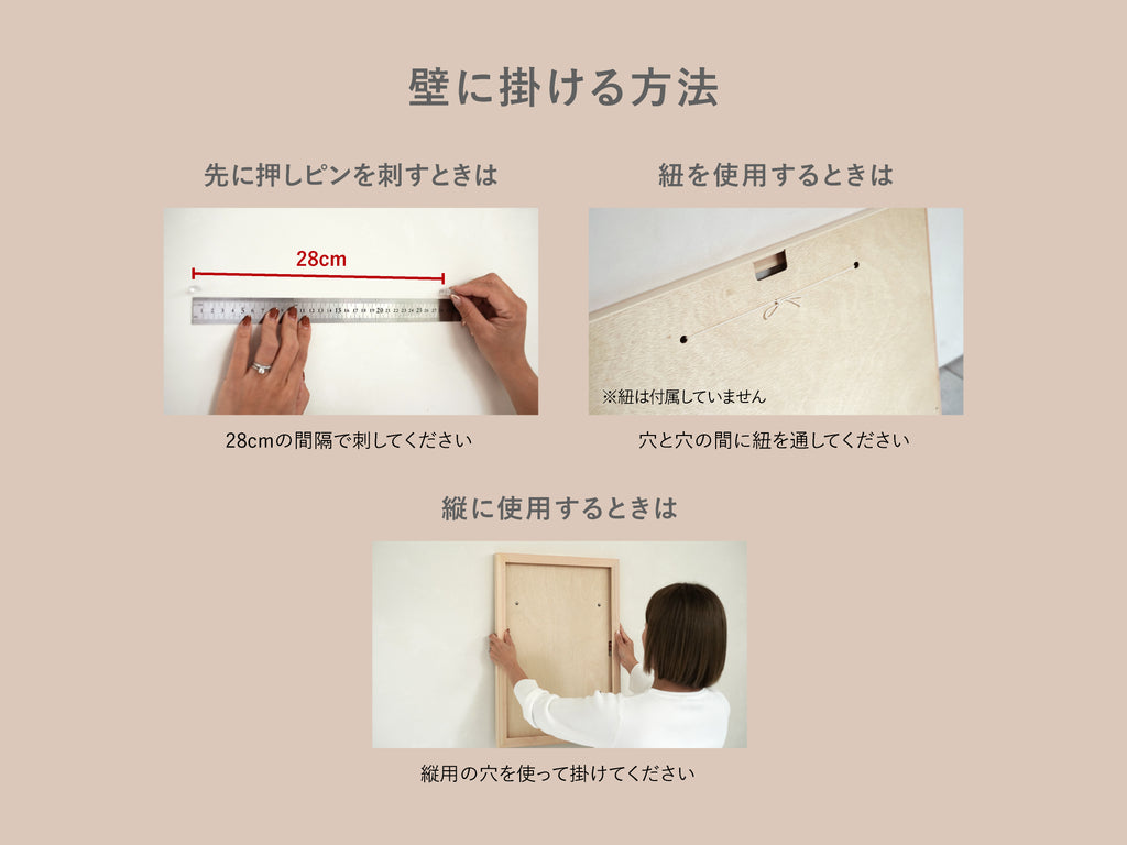 裏面の穴に押しピンを引っ掛けたり、手持ちの紐を結んで吊るしたりすることができます。作品に合わせて縦横どちらの向きでも飾れます。