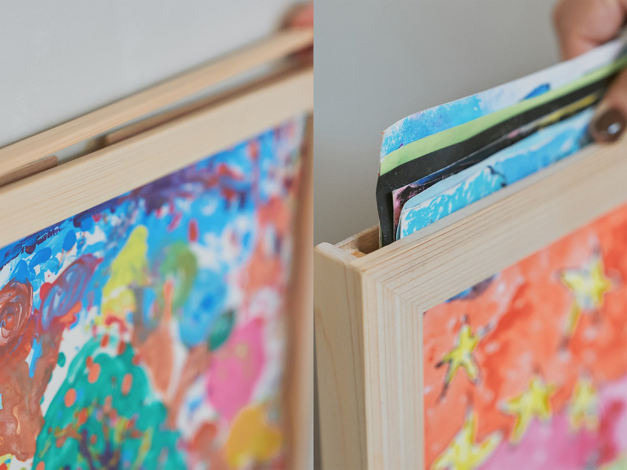 園や学校から持ち帰る、A4〜四つ切り画用紙サイズまでの作品を飾れる大きなアートフレーム。飾りたい一枚を表にして、ほかの作品は中に数枚重ねてしまっておける、収納も兼ねたつくりです。表面カバーがないため、絵の具の重なりや紙の質感を直に感じられ、作品そのものの表情が楽しめます。厚みや立体感のあるコラージュ作品にもぴったりです。