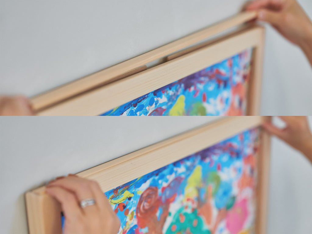 フレームの一辺がマグネット式で開閉できるふたになっています。さっと開けて作品を取り出せるので、入れ替えもスムーズ。最大5〜10枚ほどの作品をしまっておけるのもうれしいポイントです。ふたはフレームと一体感のあるデザインで、見た目もすっきり。