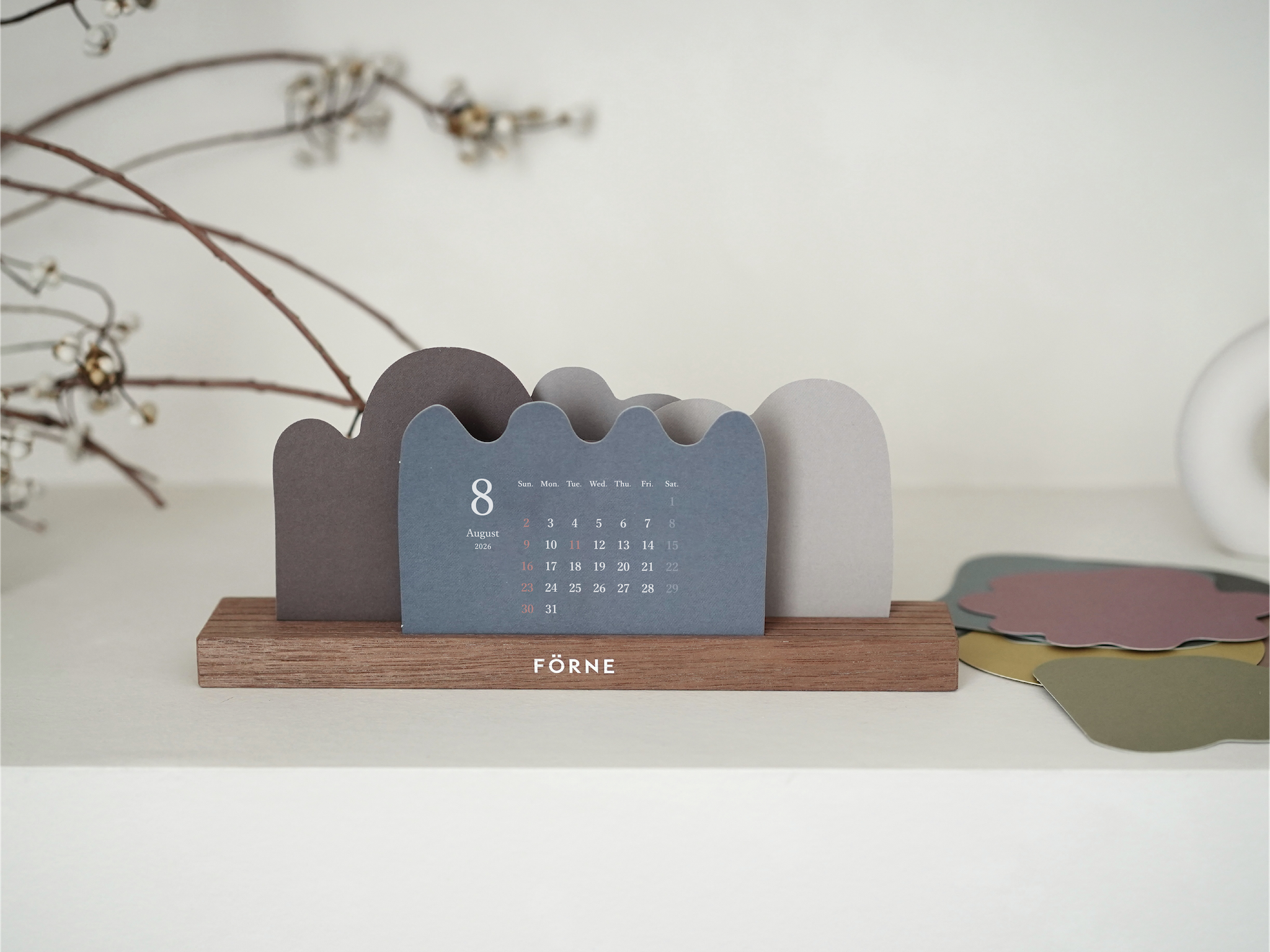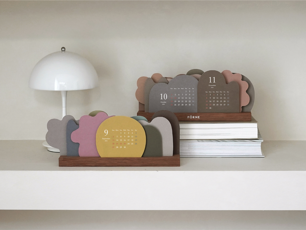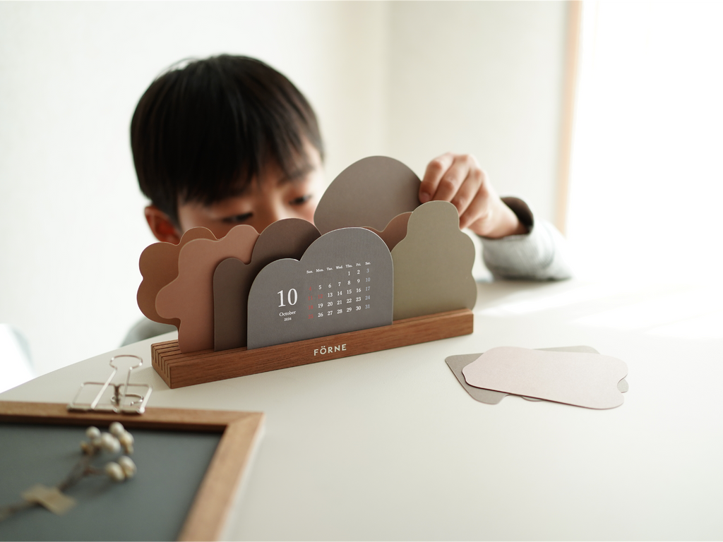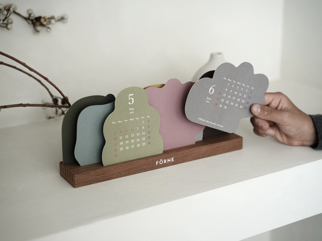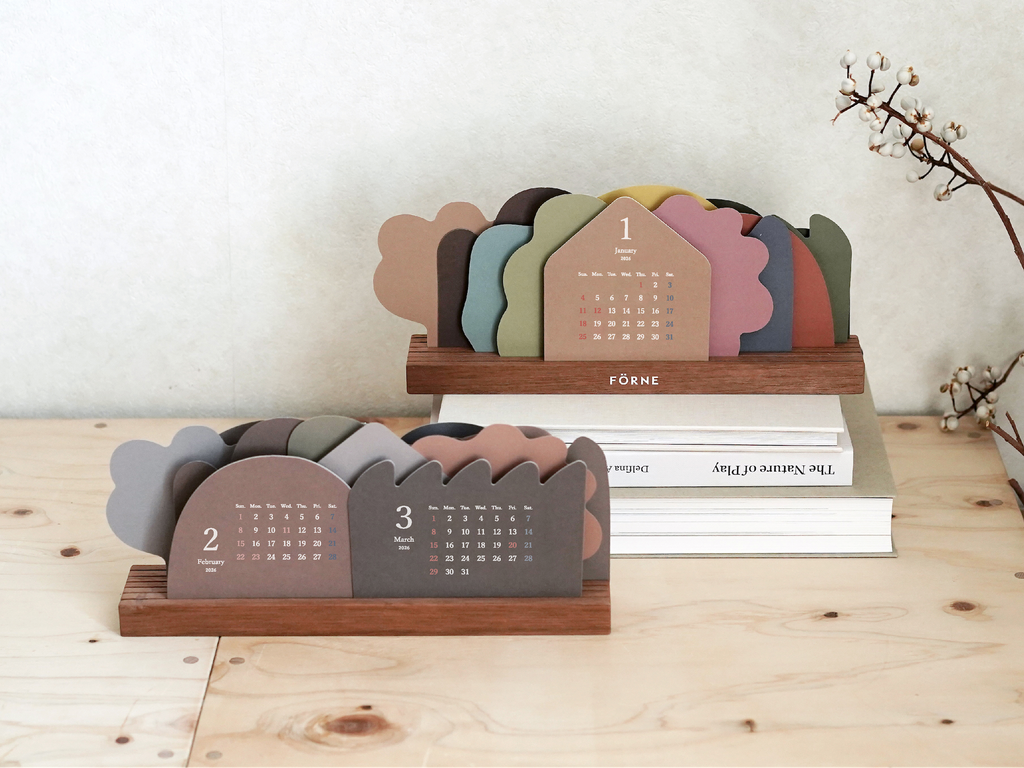 お花や木、山や雲など自然のモチーフを形取った12枚のカレンダーを木製スタンドに自由に立てて使う卓上カレンダー。