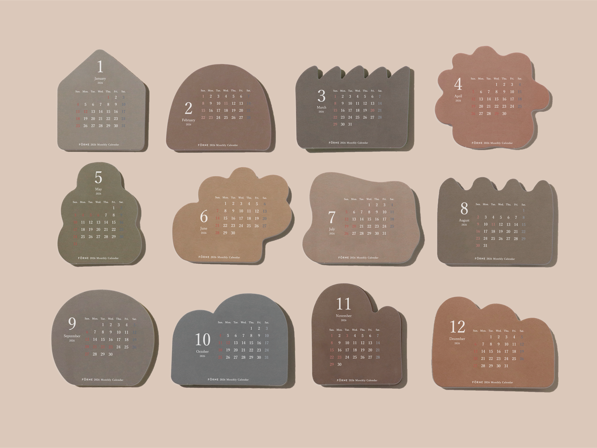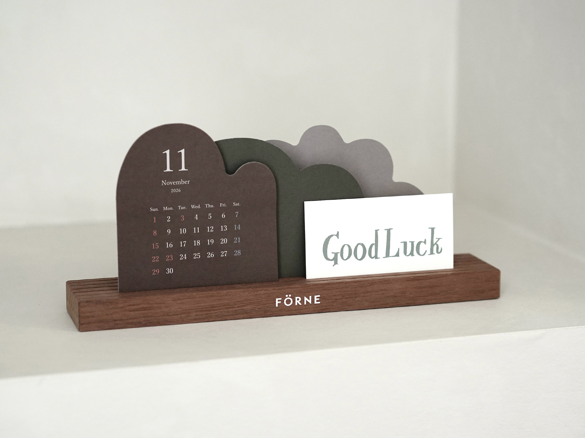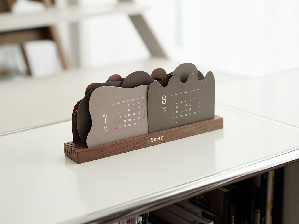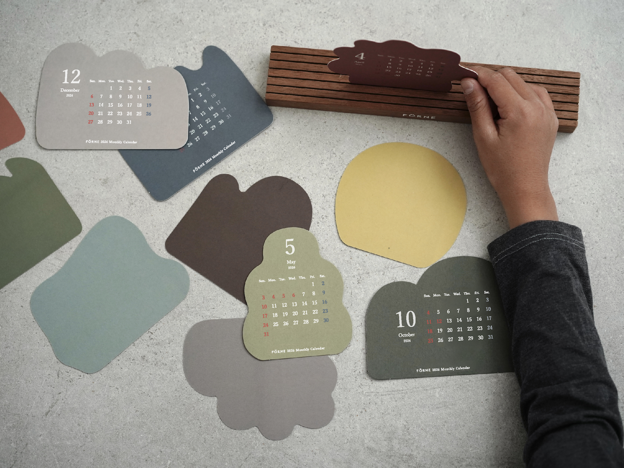 お花や木、山や雲など自然のモチーフを形取った12枚のカレンダーを木製スタンドに自由に立てて使う卓上カレンダー。