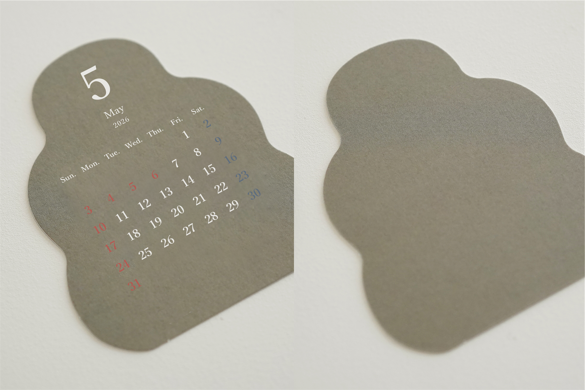 表面のカレンダーはシャープな印象の明朝体フォント。曜日は英語で記載しています。