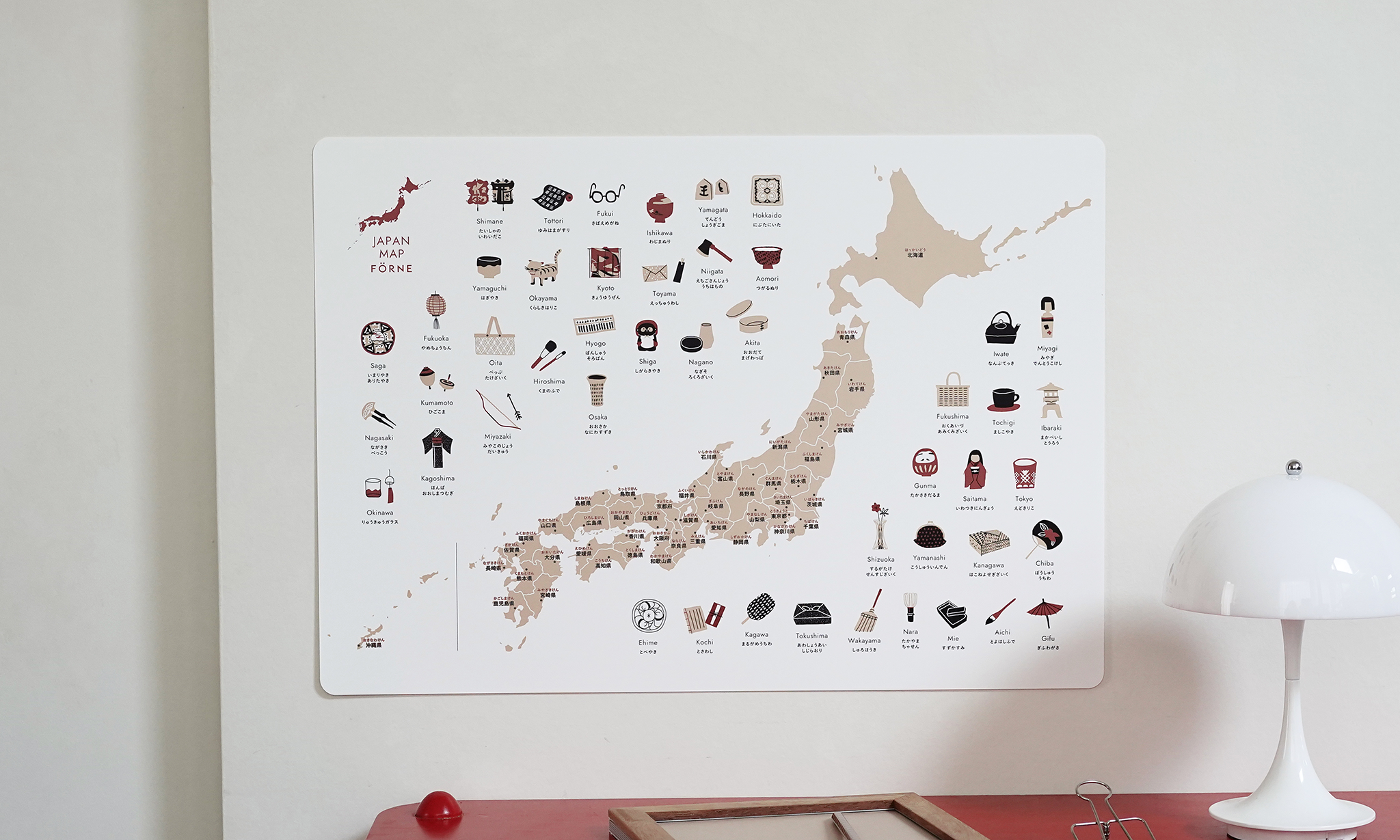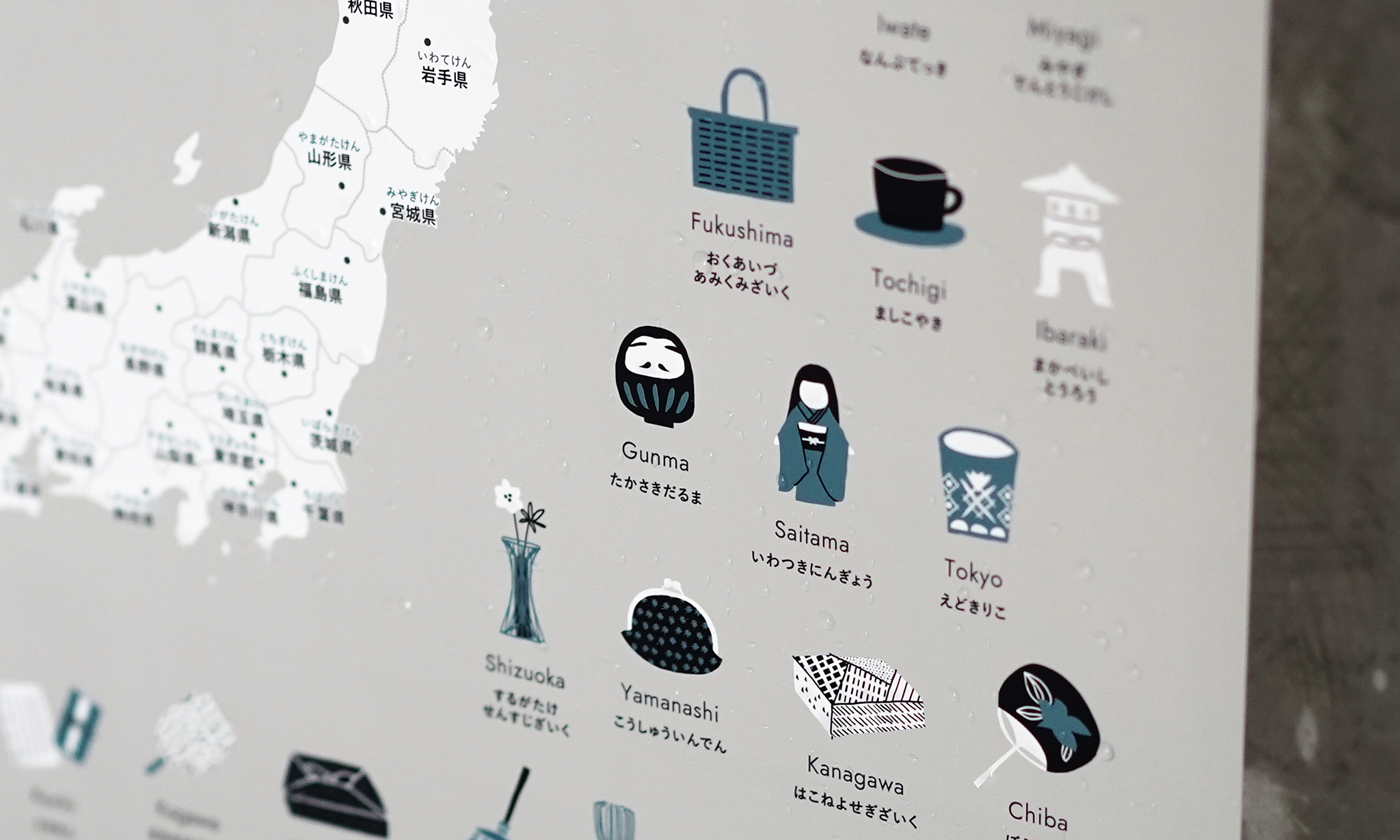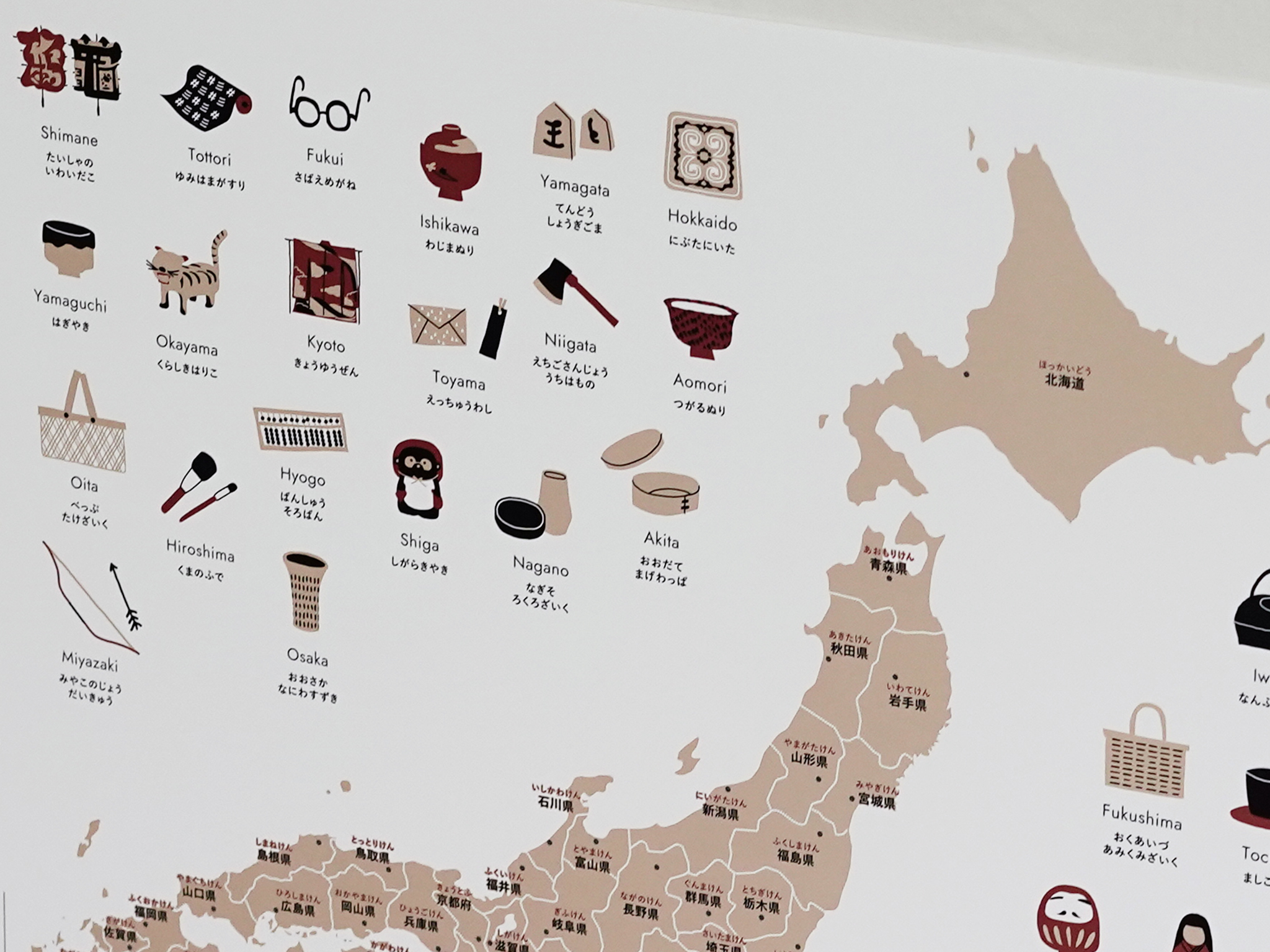 地図の周りにちりばめたイラストは、その土地でつくられる暮らしの道具や工芸品を表現。