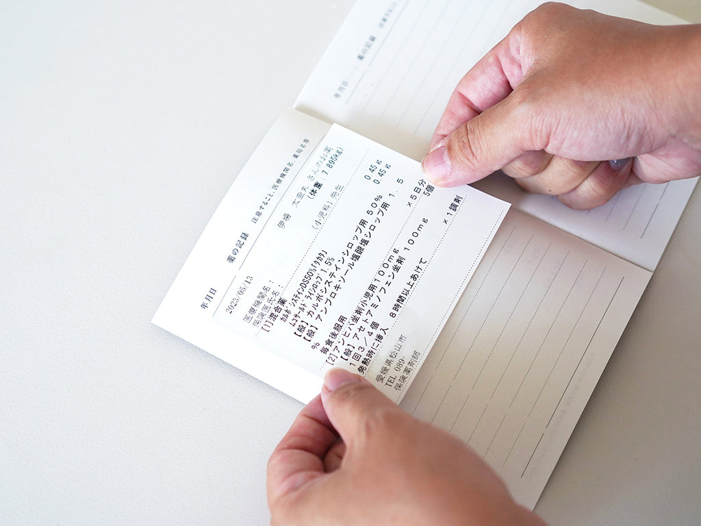 表紙&裏表紙にはやさしい印象のマットな紙を使用。中ページの紙は、お薬のシールを貼りやすいほどよい厚みに仕上げました。