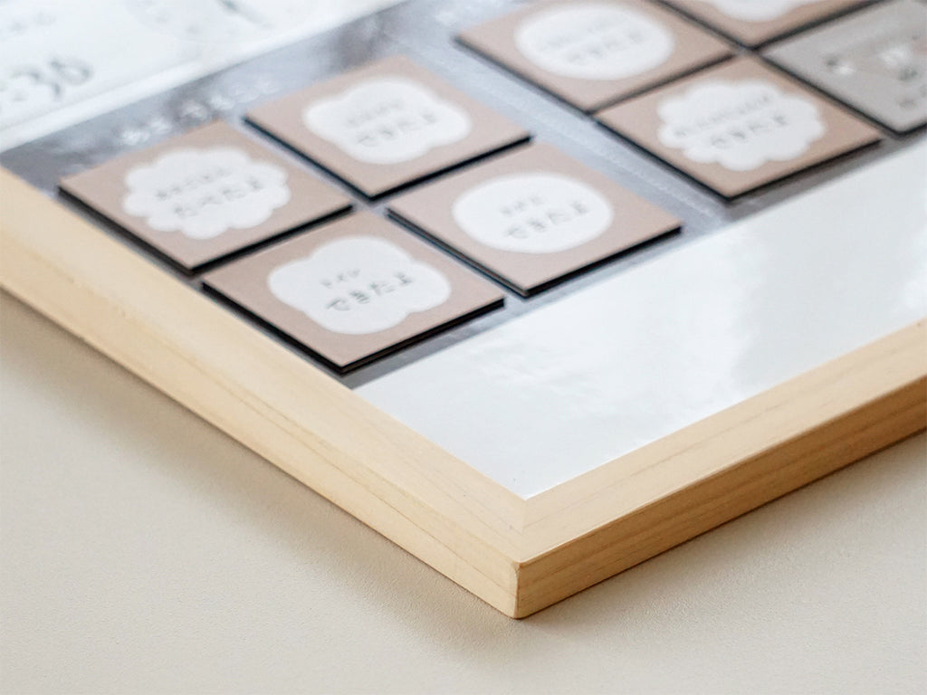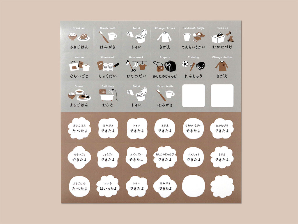 「てあらいうがい」「あしたのじゅんび」「しゅくだい」などをイラストとひらがなで表したToDoシールは、全部で16種類。それぞれ「できたよ」シールとセットになっています。ライフスタイルに合わせて、マグネットシートの裏表に必要なToDoを選んで貼り付けます。また、空白のシールも2セット付いているのでオリジナルのToDoを自作することもできます。