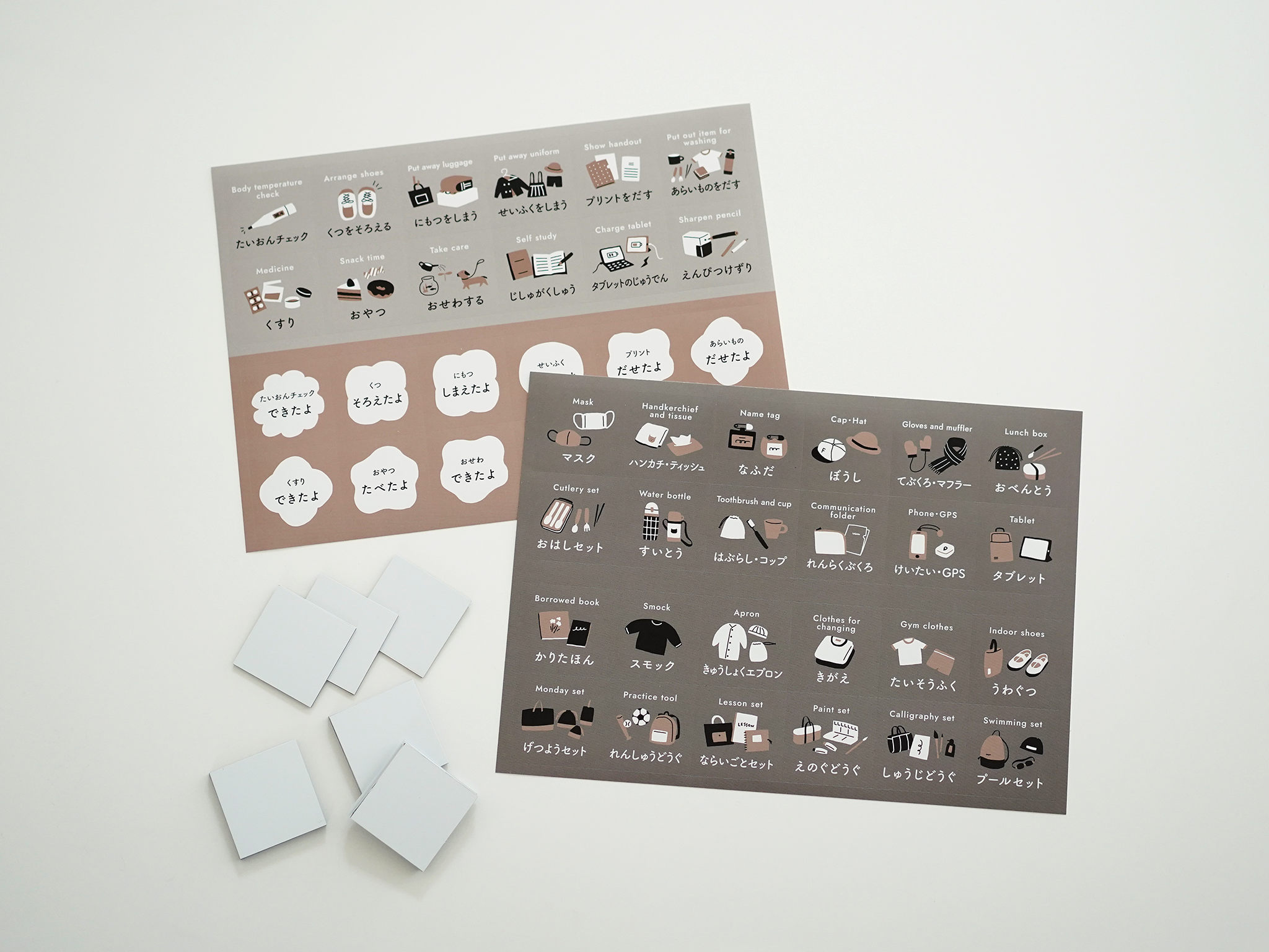 毎朝の持ち物の準備や確認にぴったりな「持ち物シール マグネット付き」の展開もあります。セット使いもおすすめです。