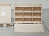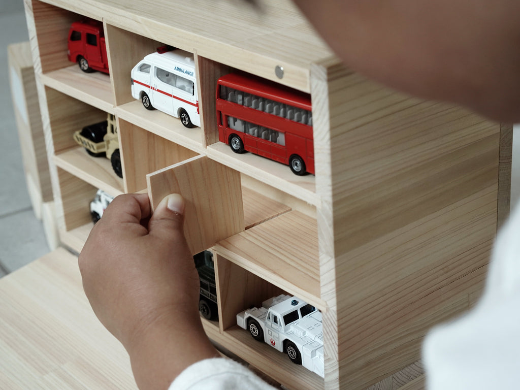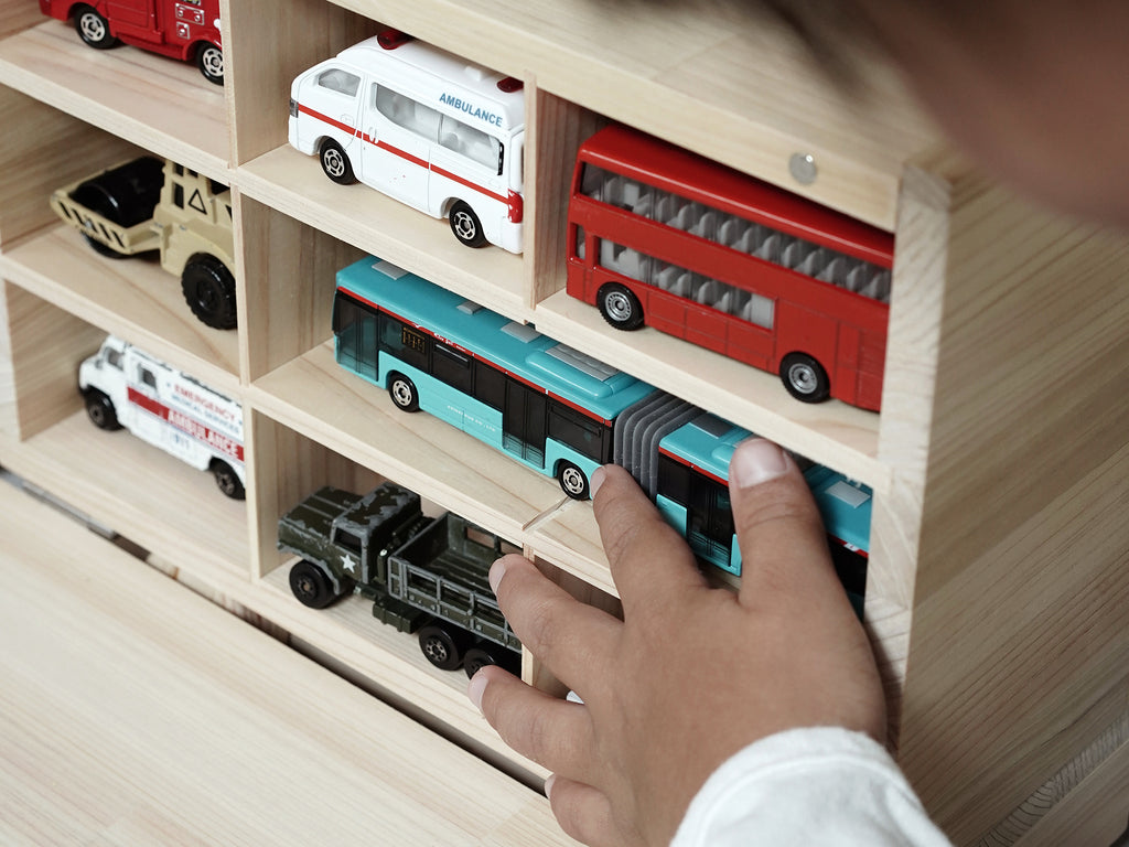 ミニカーを片面に最大9台、両面で合計最大18台収納可能な仕切りコンテナ。扉はマグネット式でパタンと気持ちよく閉まります。