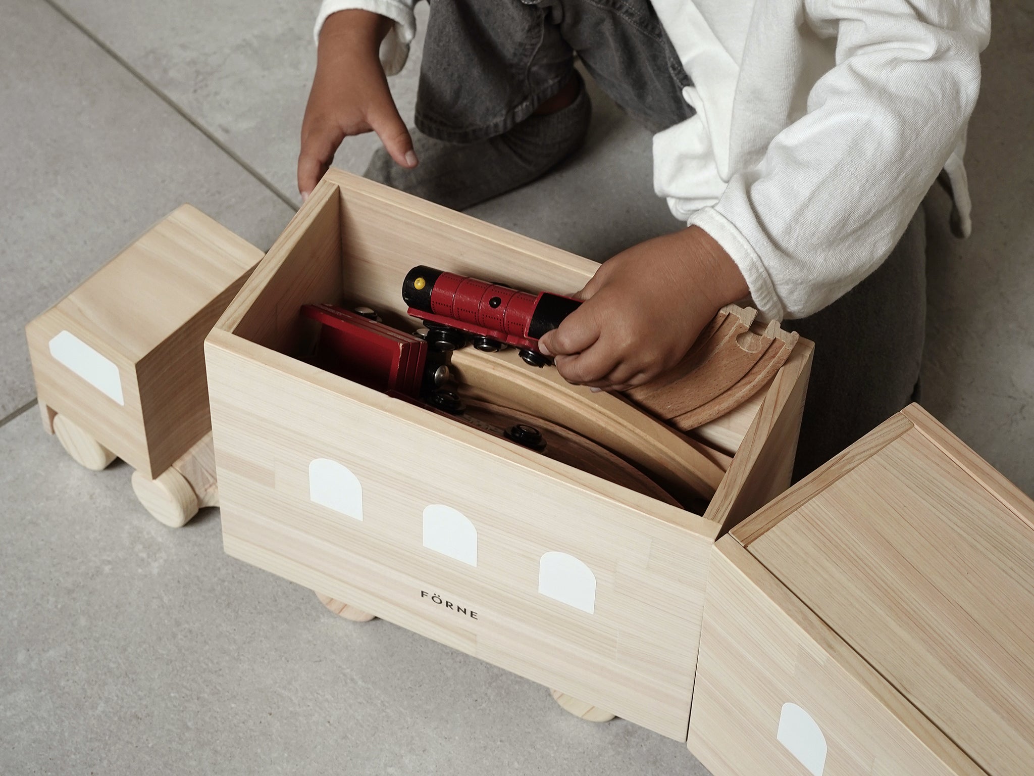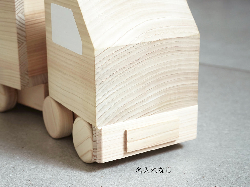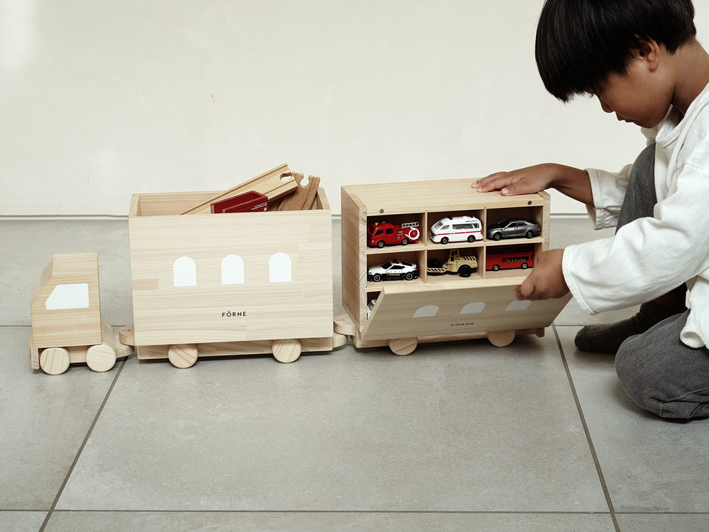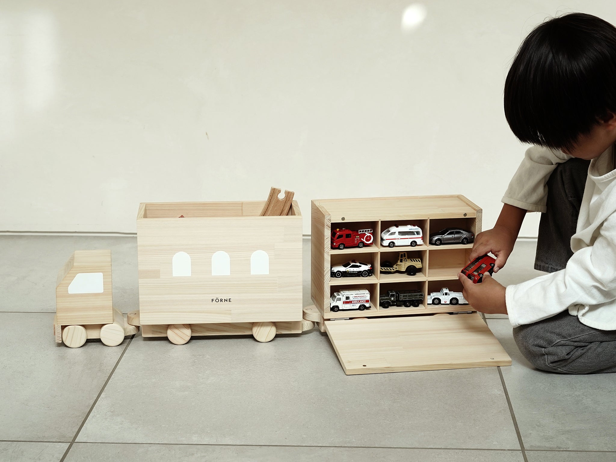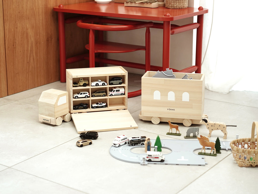 お気に入りのミニカーをたっぷりしまえる木製トラック。中に並べるだけでなく、トラック自体を走らせて遊ぶこともできます。ヘッドのプレートには名前を入れられるので、“自分だけのおもちゃ”という特別感も。フリーコンテナ付きの2両タイプなら大きめのおもちゃも一緒に入れられるので、片付けの幅がぐっと広がります。