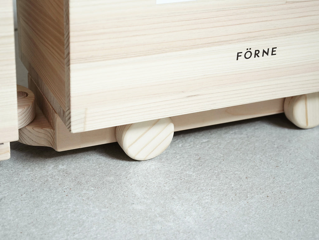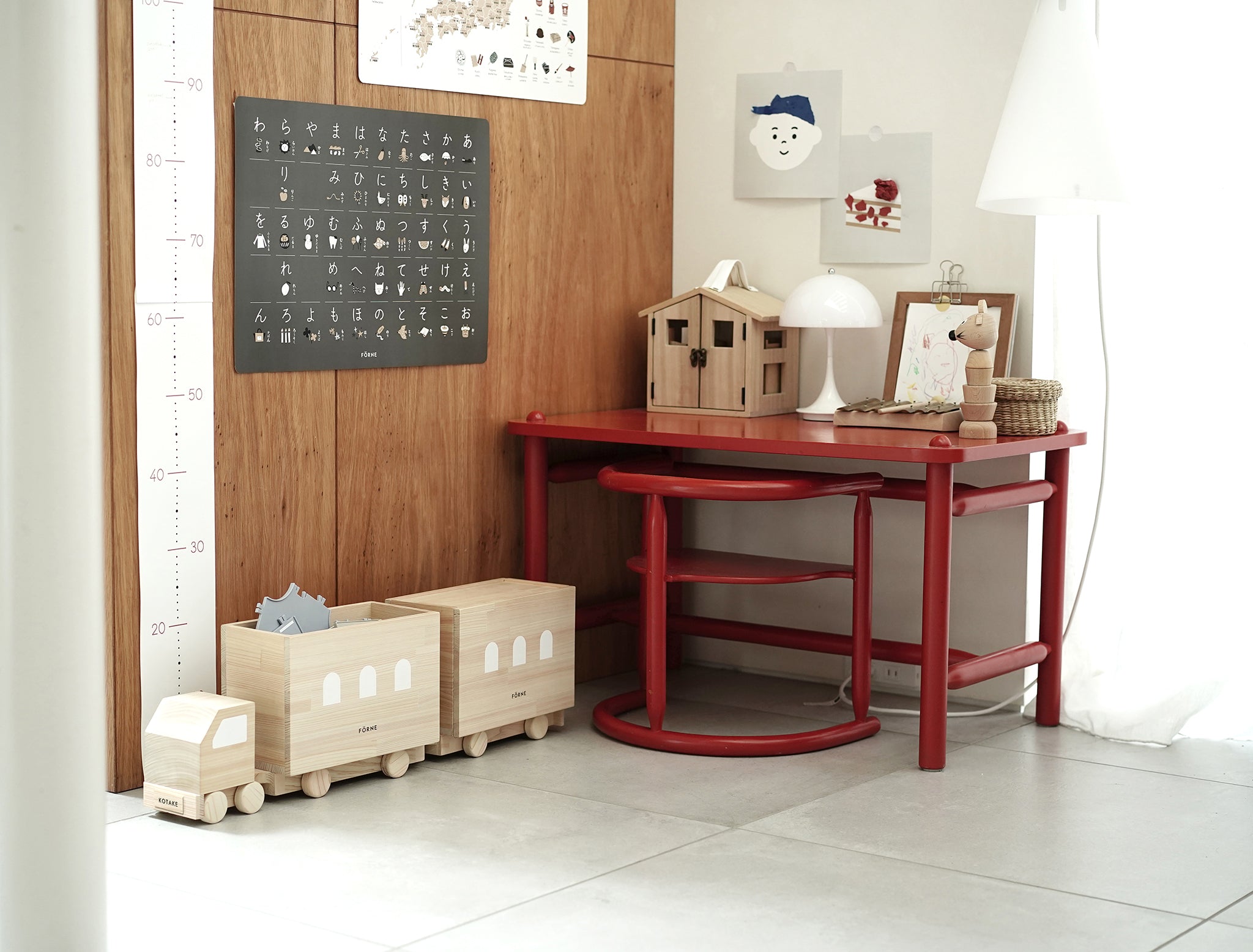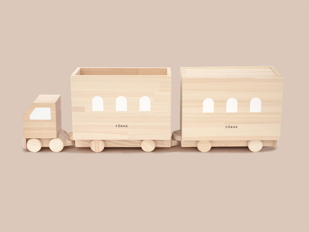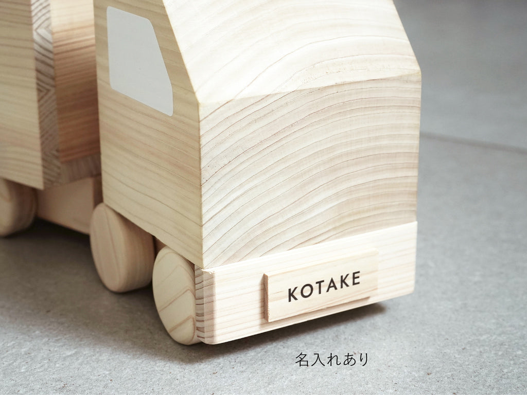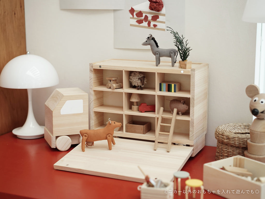 お気に入りのミニカーをたっぷりしまえる木製トラック。中に並べるだけでなく、トラック自体を走らせて遊ぶこともできます。ヘッドのプレートには名前を入れられるので、“自分だけのおもちゃ”という特別感も。フリーコンテナ付きの2両タイプなら大きめのおもちゃも一緒に入れられるので、片付けの幅がぐっと広がります。