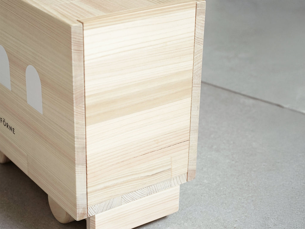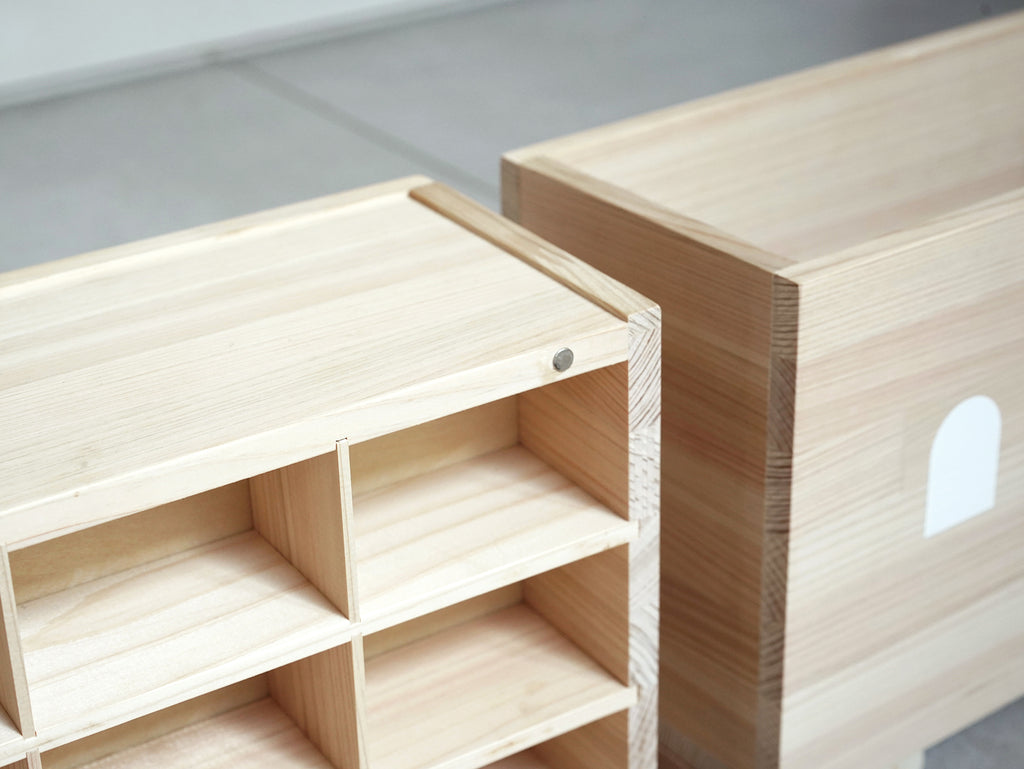 木の質感をそのまま生かしたすっきりとしたフォルムに、白い窓とロゴだけを添えたシンプルなデザイン。インテリアの雰囲気を損なわず、空間にすっとなじむのが大人目線でもうれしいポイントです。子どもが遊んだあともそのままリビングに置いておきたくなる佇まいです。