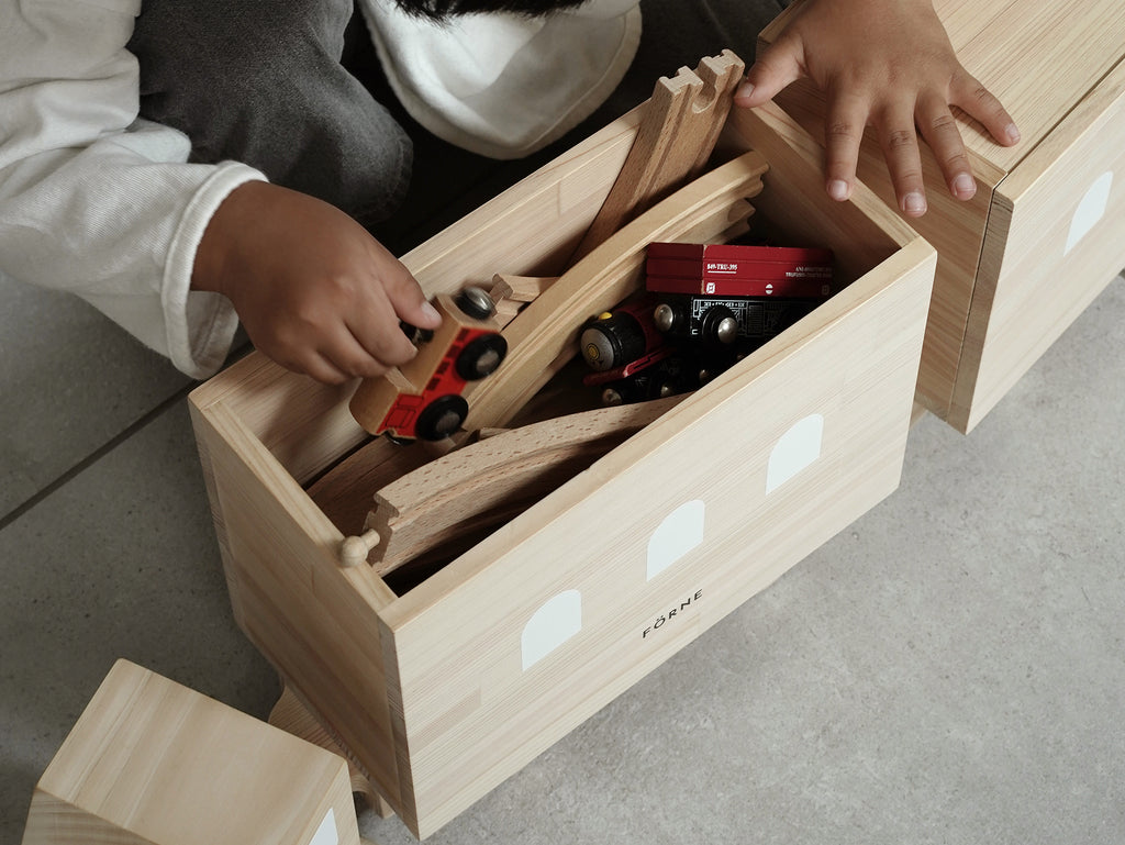ミニカーだけでなくレールなどの大きめのおもちゃも入れられるフリーコンテナ。仕切りがないから、自由に使えます。